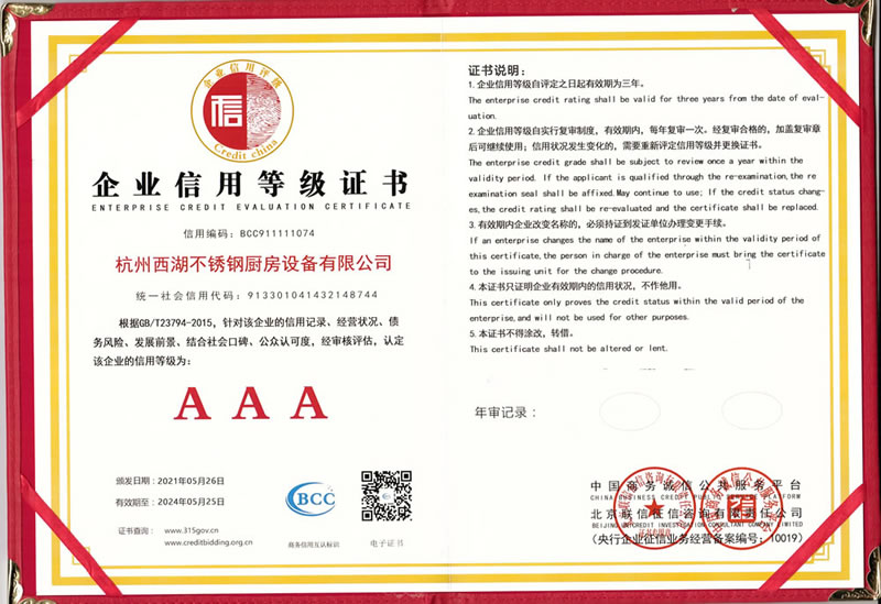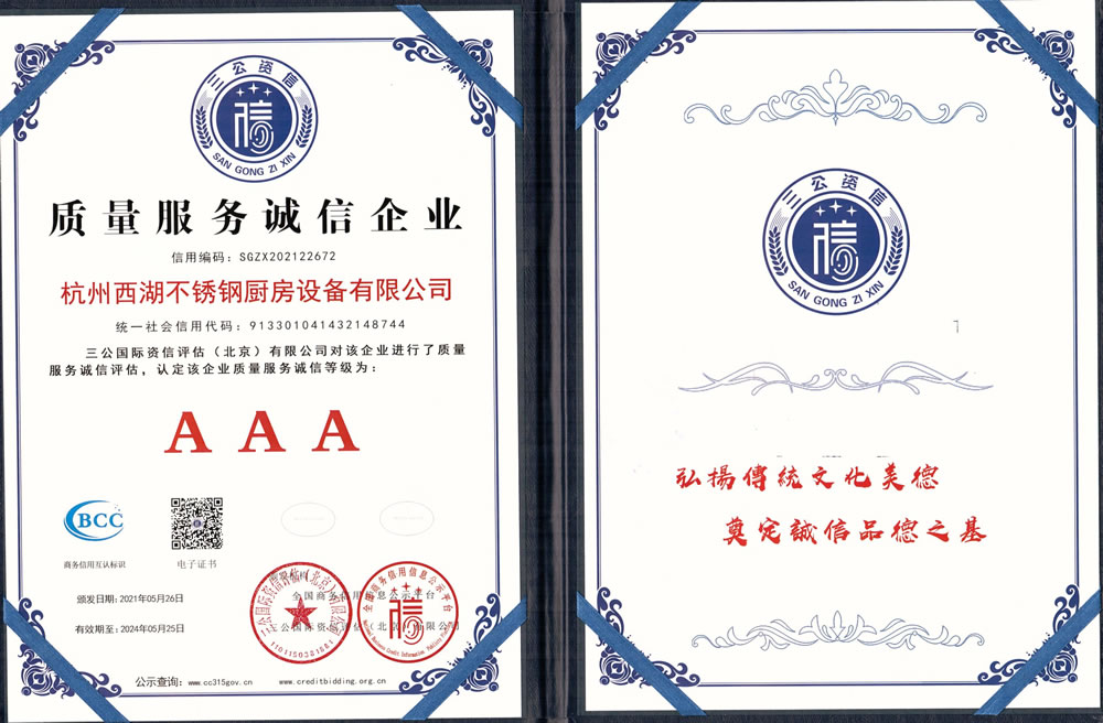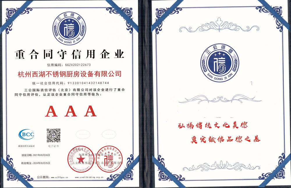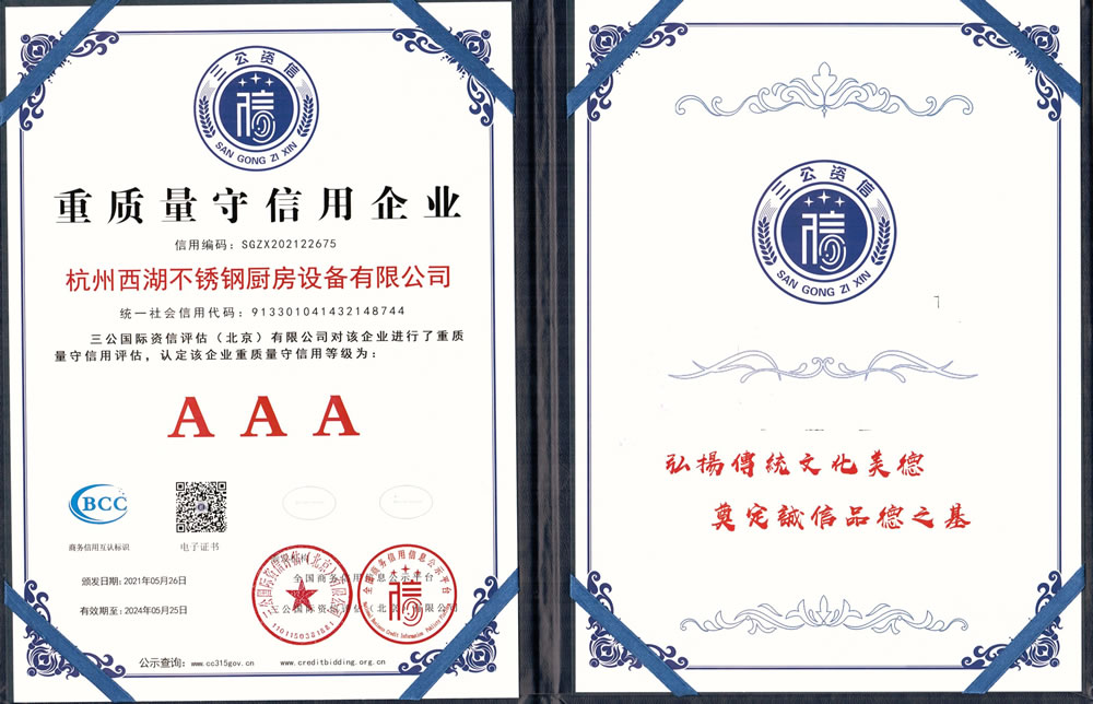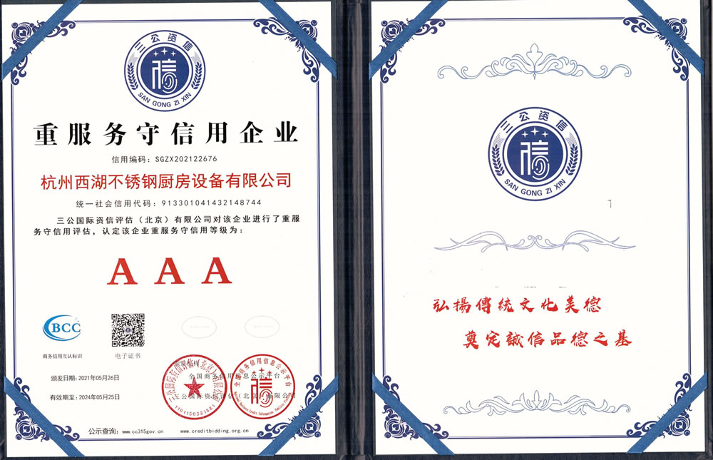 杭州西湖不銹鋼廚房設備有限公司成立20年以來,通過一系列創造性的工作,凝聚企業力量,發揮自身優勢,助推企業發展和品牌建設,取得了一些榮譽,這是廣大西湖員工共同努力和各位新老客戶共同支持的結果,我們將再接再厲創造更多的輝煌!